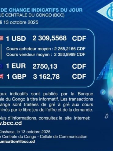 RDC : la Banque Centrale du Congo vient de publier le nouveau taux de change La Banque Centrale du Congo (BCC) a annoncé, ce lundi 13 ...
